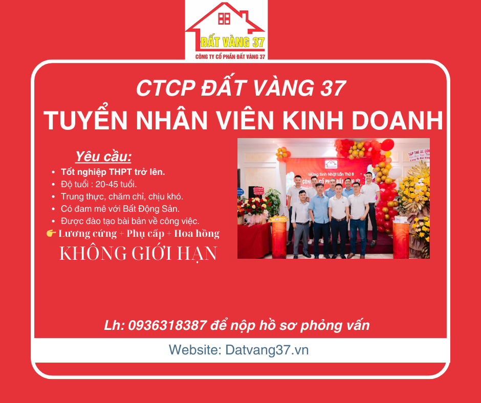 Bạn đang tìm một công việc năng động, thu nhập hấp dẫn và cơ hội phát triển lâu dài? Hãy gia nhập Công ty Cổ phần Đất Vàng 37 – đơn vị hàng đầu trong lĩnh vực bất động sản tại Nghệ An và Hà Tĩnh!